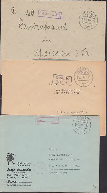 Riesa Barfrankatur drei verschiedene Freimachungsstempel, Gebühr bezahlt