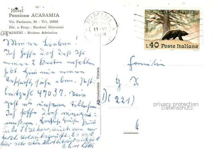 Rimini Hotel Pensione Acasamia Rimini postalisch gelaufen 1968 Erhaltung siehe scans [WerneD78] WernPID7