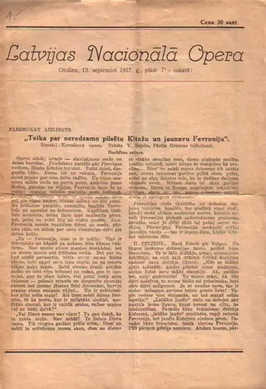 Rimskij - Korsakov: Programmzettel zu: Teika par neredzamo pilsetu Kitezu un jaunavu Fevroniju. Rimskij - Korsakova opera 4 cellenos. Aufführung: Latvijas Nacionala Opera , Otrdien , 13 septembri 1927. Programmzettel mit Inhaltsangabe.