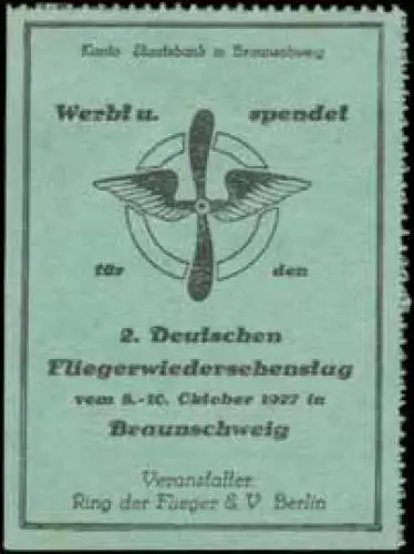 Werbt und spendet für den 2. Deutschen Fliegerwiedersehenstag vom 8.-10. Oktober 1927 in Braunschweig, Größe/Zustand: 4x3 , guter Zustand, Original alte Reklamemarke die seinerzeit für die Werbung benutzt wurde