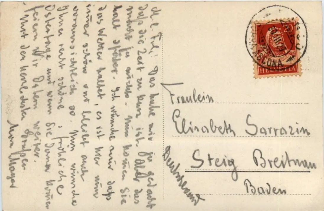 Danke. Alles Bestens. Können Sie mir allenfalls mitteilen, aus welchem Jahr die Postkarte stammt? Besten Dank.