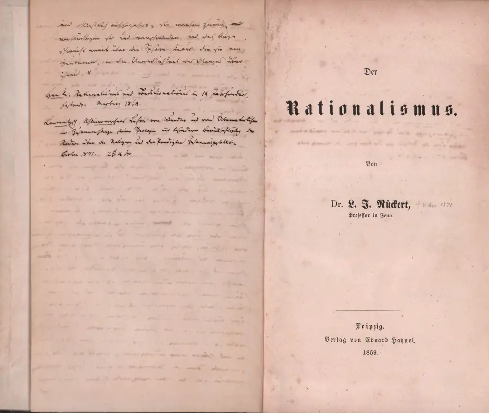 L. I. Rückert (1797-1871), Professor der Theologie u. Geheimer Kirchenrat in Jena (BBKL 8, Sp. 948 ff.), verteidigt den Rationalismus als "Grundpfeiler u. Rettungsanker des Glaubens" für den, "dem unentbehrlich ist, sein Urtheil durch das Denken zu bestimmen": "der Rationalismus hat in der Theologie nicht nur das volle Recht zu sein, sondern darf auch das Bewußtsein haben, daß er die Theologie der Zukunft sei" (s. 194 f.). - Hintedeckel ohne Bezug und wasserspurig, stellenw. Bleistiftanstreich., ausführliche Notizen von alter Hand aV