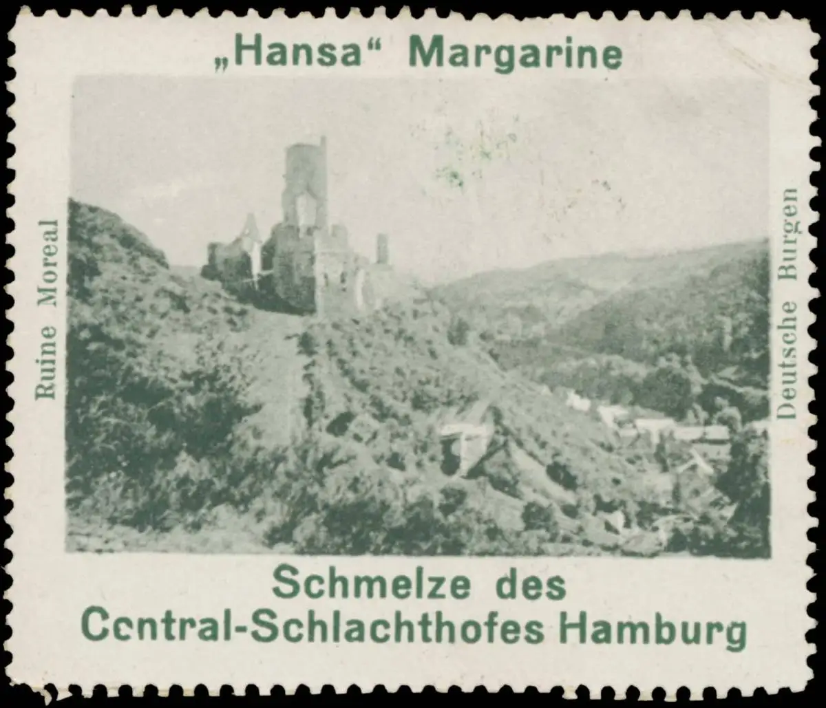 Deutsche Burgen, Hansa-Margarine, Schmelze des Central-Schlachthofes , Größe/Zustand: 5x6 , leicht fleckig, Original alte Reklamemarke die seinerzeit für die Werbung benutzt wurde