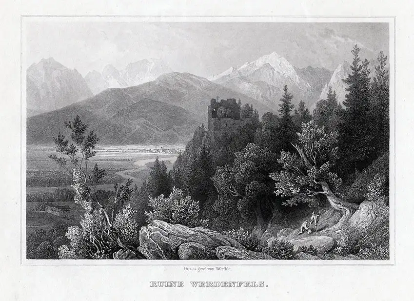 Ruine Werdenfels bei Garmisch - Stahlstich um 1850