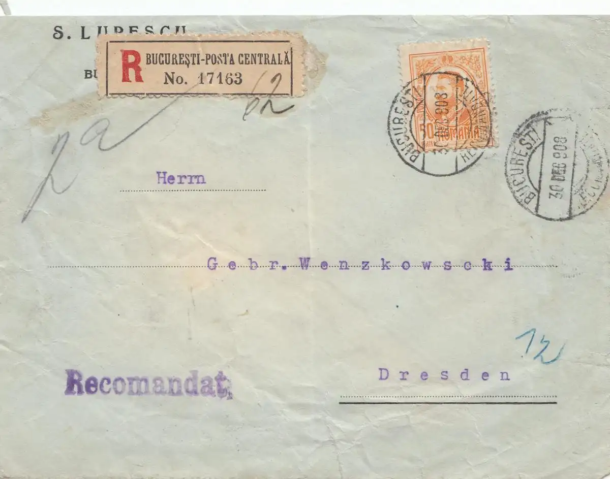 Rumänien: 1908: Einschreiben Bucuresti nach Dresden