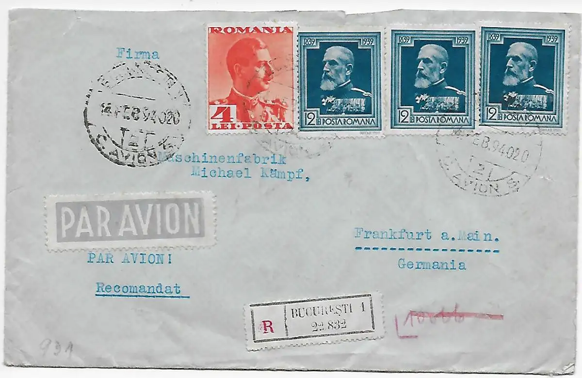 Rumänien: Einschreiben Bucaresti als Luftpost nach Frankfurt, OKW Zensur
