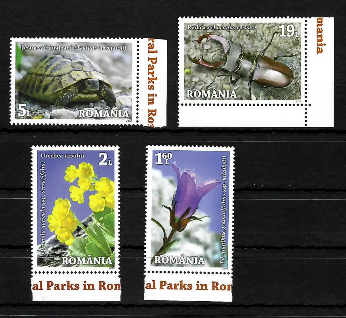 Rumänien: Rumänische Nationalparks, Käfer, Schildkröte, Blumen, 4 Briefmarken