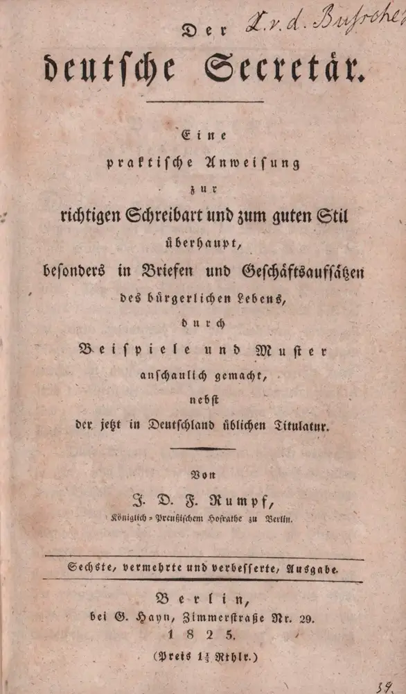 Rumpf, J. D. F. [Johann Daniel Friedrich]: Der deutsche Secretär. Eine praktische Anweisung zur richtigen Schreibart und zum guten Stil ... durch Beispiele und Muster anschaulich gemacht. 6., vermehrte und verbesserte Ausgabe.