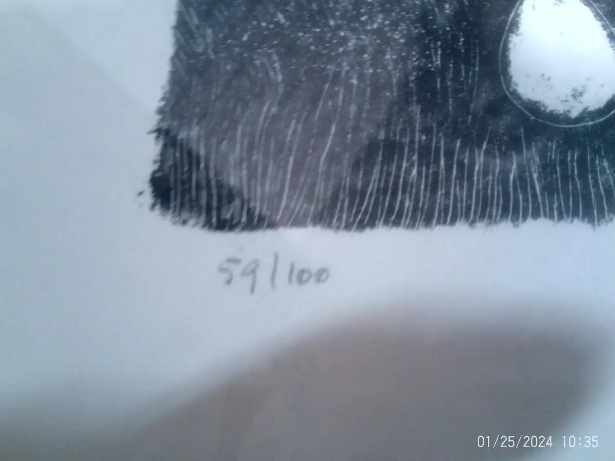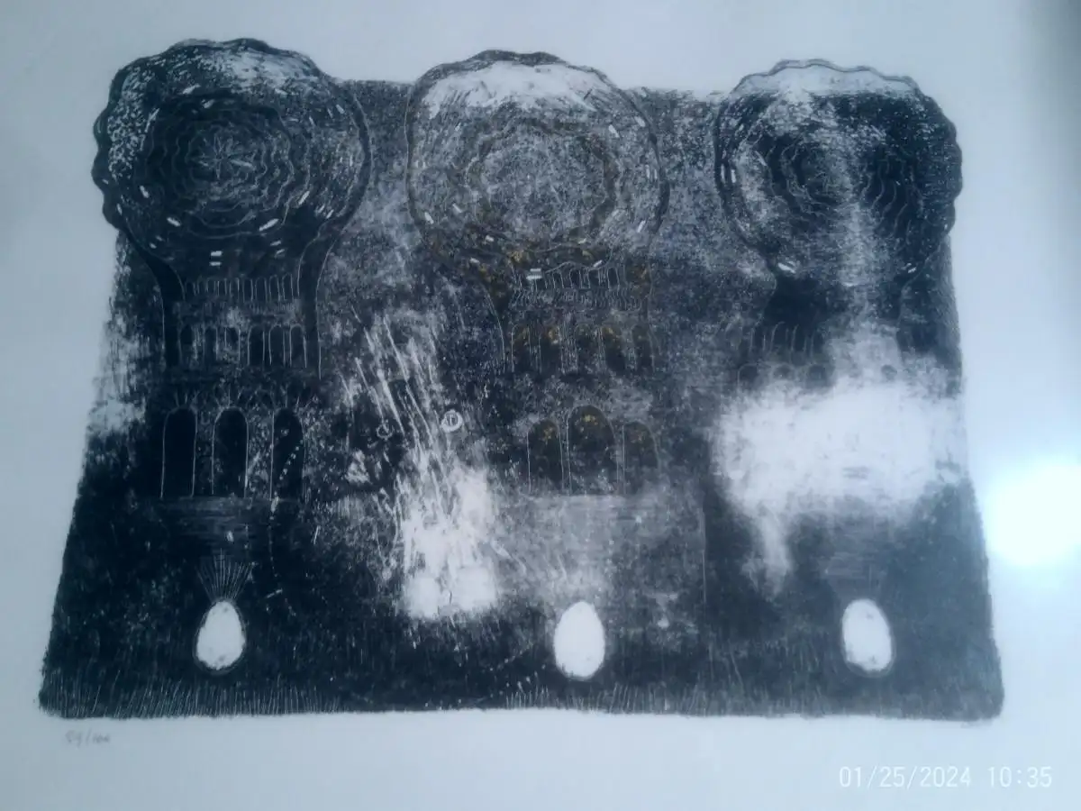 Ruth Eitle 1926-1989 Themenfeld ist : "Musik Olivier Messiaens"Blatt 59/100 Lithographie auf Papier 66 cm – 52 cm Originale Rahmung ist erhalten signiert datiert 1975 Mitglied im Künstlerbund Tübingen. Eine seltene Arbeit unter Verwendung von Gold und Silber !