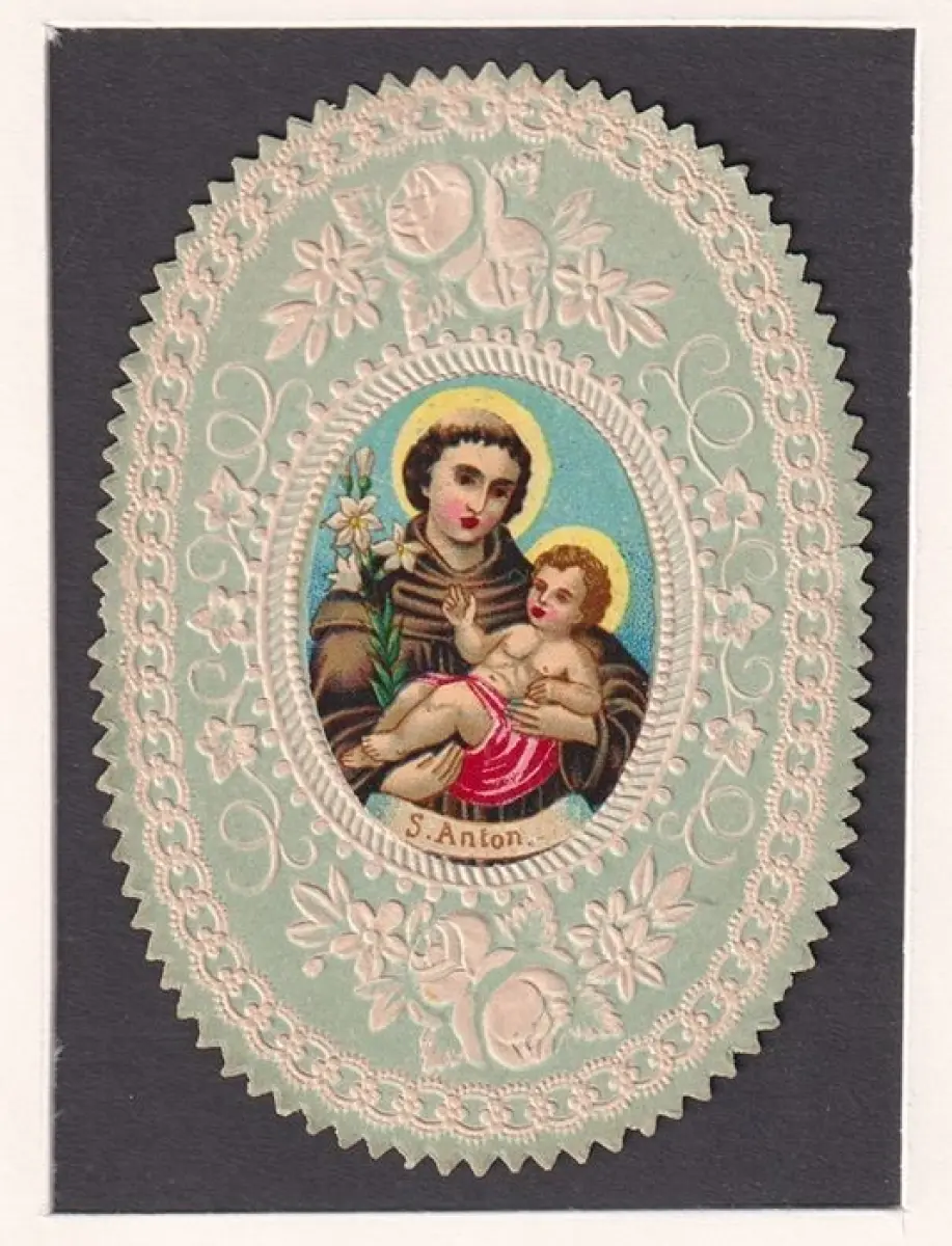 Bemerkungen: Auf einem pastellgrünen floral geprägten Medaillon ist eine Darstellung des Heiligen Antonius von Padua (1195-1231), ein Franziskanermönch der u. a. wegen seiner Redegewandtheit verehrt wird, zu sehen. In der Darstellung hält Antonius das Christuskind auf dem Arm, in einer Hand hält es eine Lilie. Der Gedenktag des Heiligen Antonius ist der 13. Juni.