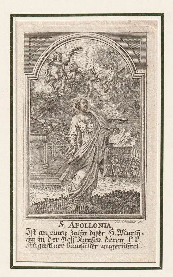 Bemerkungen: In einer antiken Tempellandschaft ist die Heilige Apollonia, die 248 in einem Pogrom gegen die Christen in Alexandria ihr Martyrium erlitt, zu sehen. In ihrer linken Hand hält sie eine Schale mit einer Zange. Nachdem man ihr die Zähne ausgeschlagen hatte, drohte man ihr mit dem Scheiterhaufen sollte sie dem christlichen Glauben nicht abschwören. Apollonia weigerte sich und stürzte sich selbst in die Flammen. Sie gilt als Patronin der Zahnärzte. Ihr Gedenktag ist der 9. Februar. Seit dem 4. April 1785 befindet sich in der Wiener Augustinerkirche ein angeblicher Zahn der Heiligen in einer kostbar gestalteten Monstranz, die Kaiserin Maria Leopoldine, nach der Heilung ihres Sohnes Leopold von einem Zahnleiden, gestiftet hatte.
