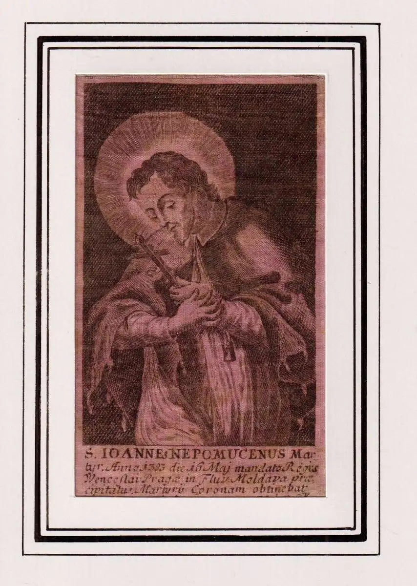 Bemerkungen: Dargestellt ist der Brückenheilige Johannes von Nepomuk (1350-1393). Johannes erlitt sein Martyrium, indem er in Moldau geworfen wurde. Vorangegangen war eine Auseinandersetzung mit König Wenzel und dem Prager Erzbischof Jenzenstein. Der Gedenktag der Heiligen Johannes von Nepomuk ist der 20. März. Er wurd 1729 heiliggesprochen. Thomas Bohacz (gest. 1764) ist biographisch nicht näher greifbar.
