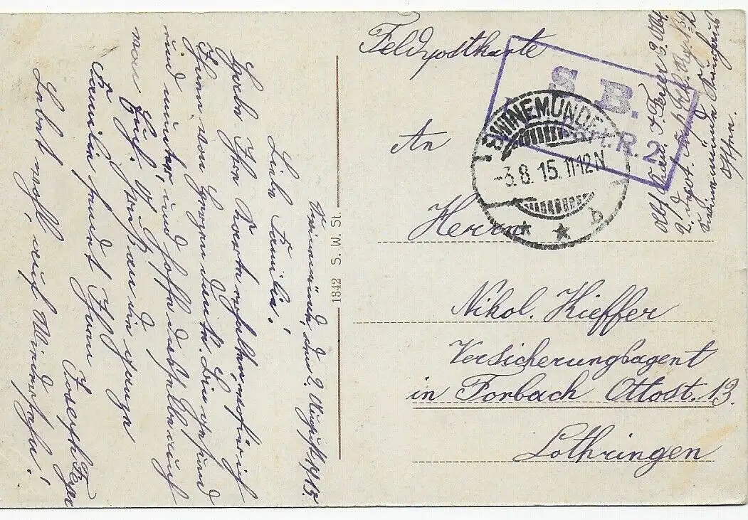 S. S. Swinemünde in der Kaiserfahrt 1915 nach Forbach/Lothringen, Feldpost
