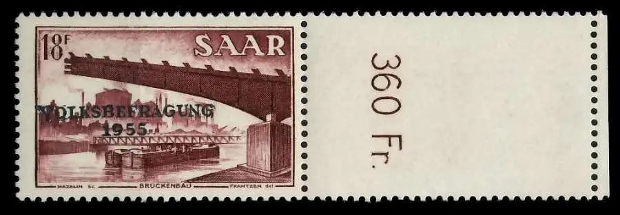 18 Fr. Wert aus der Ausgabe Volksbefragung im Saarland, mit anhängendem Leerfeld
