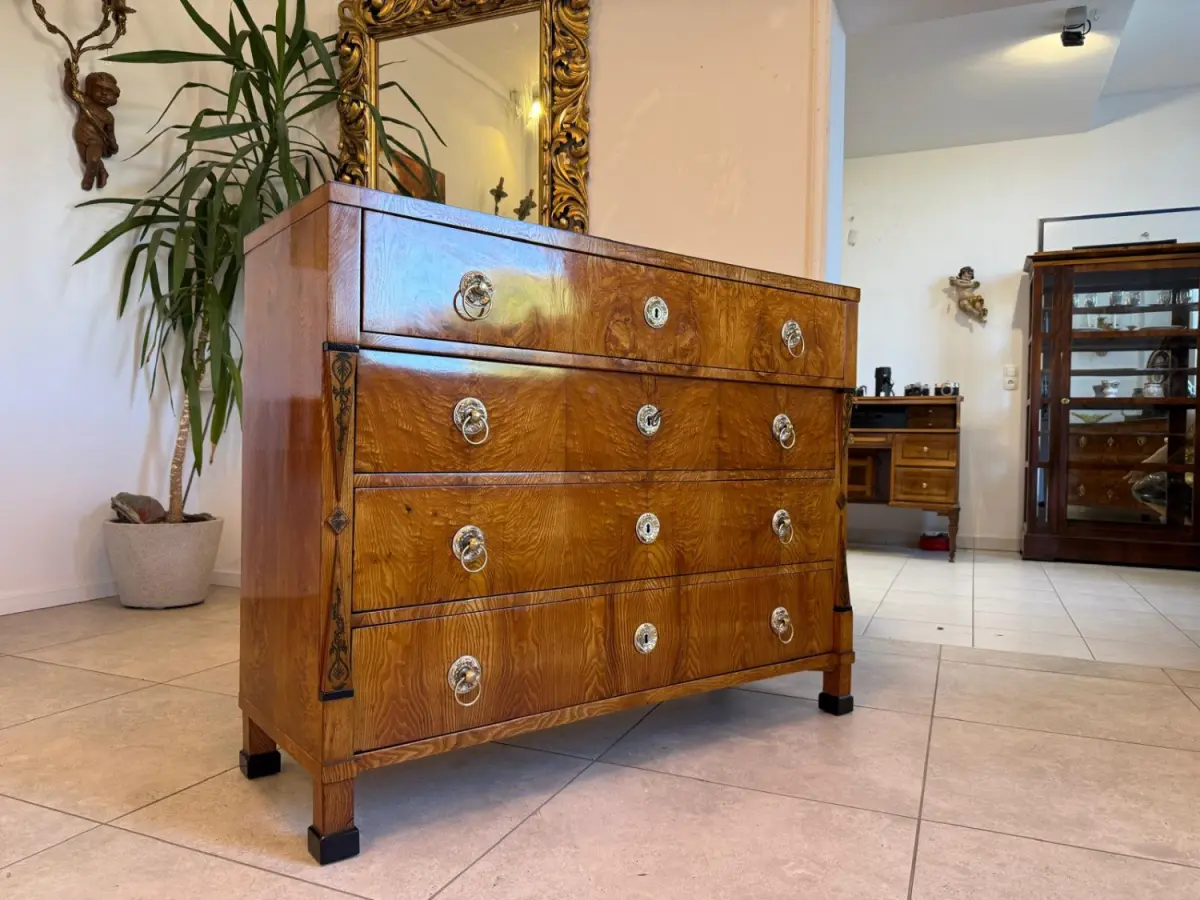 Besonders prägend sowie auffallend ist das Furnierbild aus Eschenholz welches sich am Gesamtbild der Kommode spiegelt sowie die Intarsien an den Lasenen sowie welches sich über alle 4 Laden sowie Sekretärteil erstreckt.