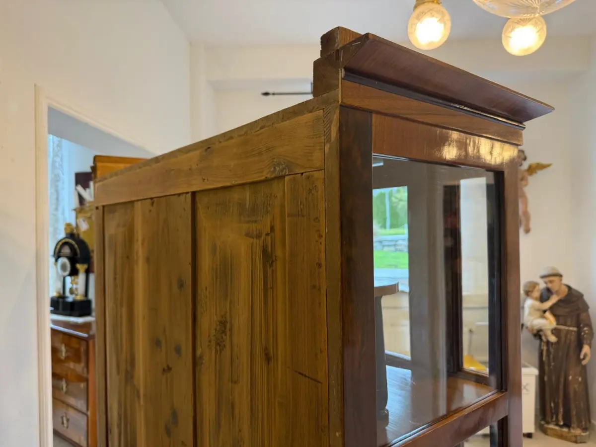 Vitrinenschrank antik, restaurierter Bücherschrank,Biedermeier Schrank, Schellack Handpolitur, antiker Glasschrank, Nussbaum Möbel, antiker Vitrinenschrank, Schrank mit Glastüren, Möbel um 1900, Handpolitur, zerlegbares Möbelstück, Antikmöbel restauriert, Sammlerstück Schrank