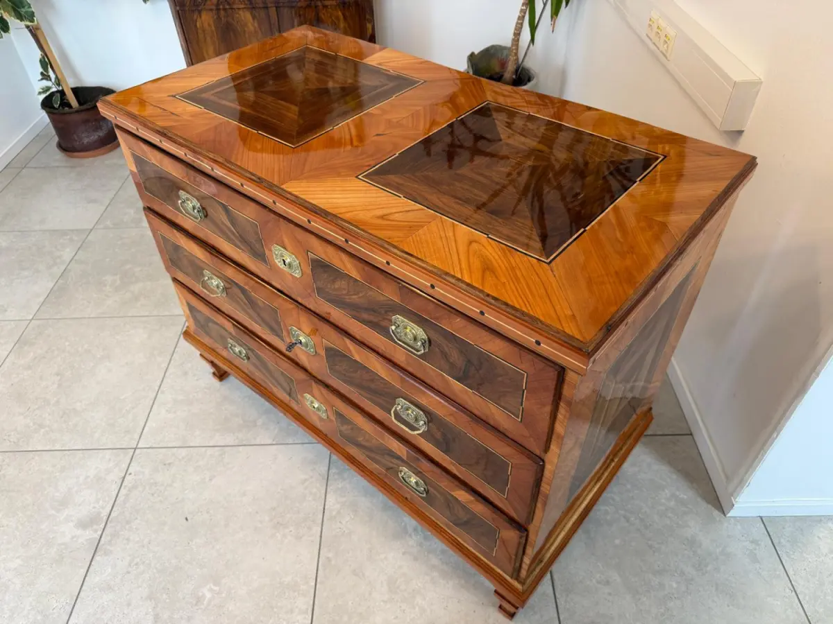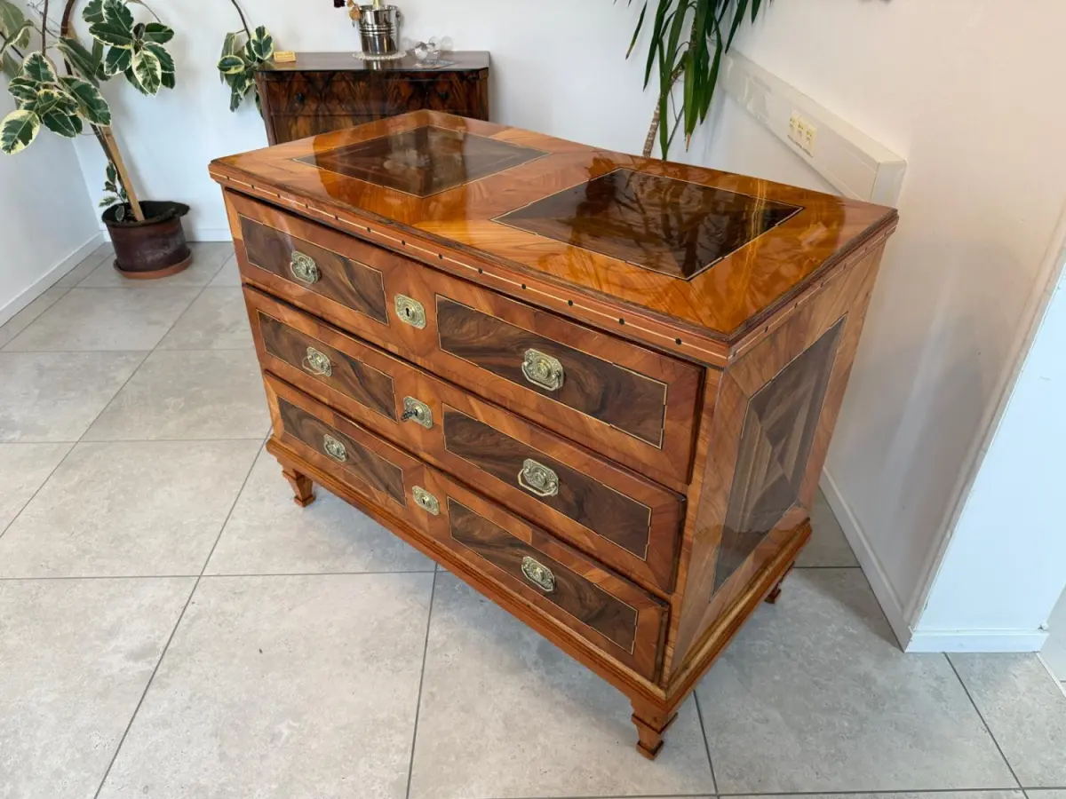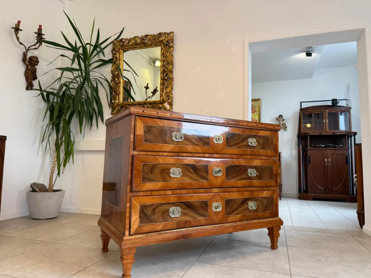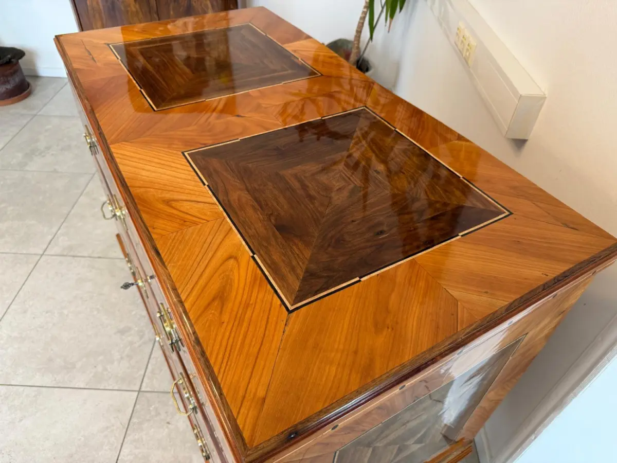 Besonders prägend sowie auffallend ist das Furnierbild aus Nussholz welches sich am Gesamtbild der Kommode spiegelt sowie welches sich über alle 4 Laden sowie Sekretärteil erstreckt.