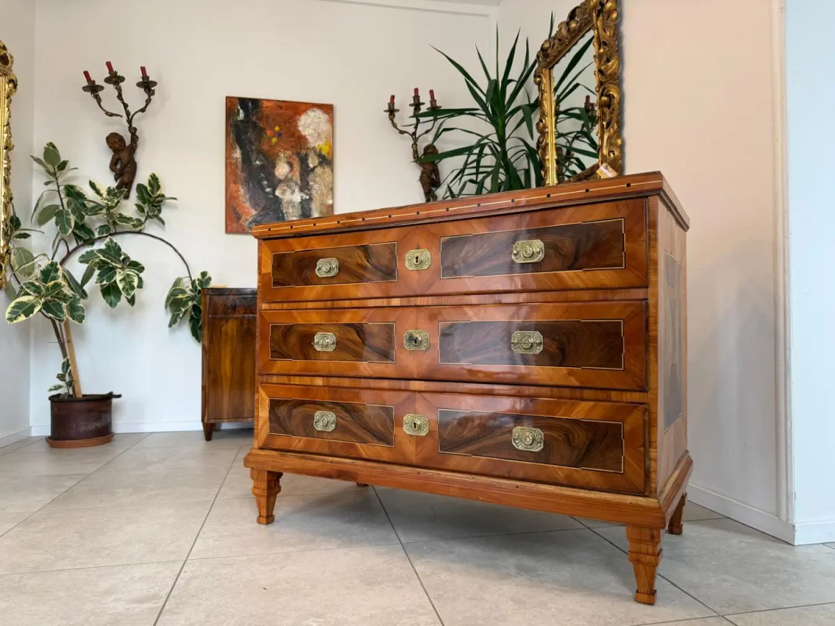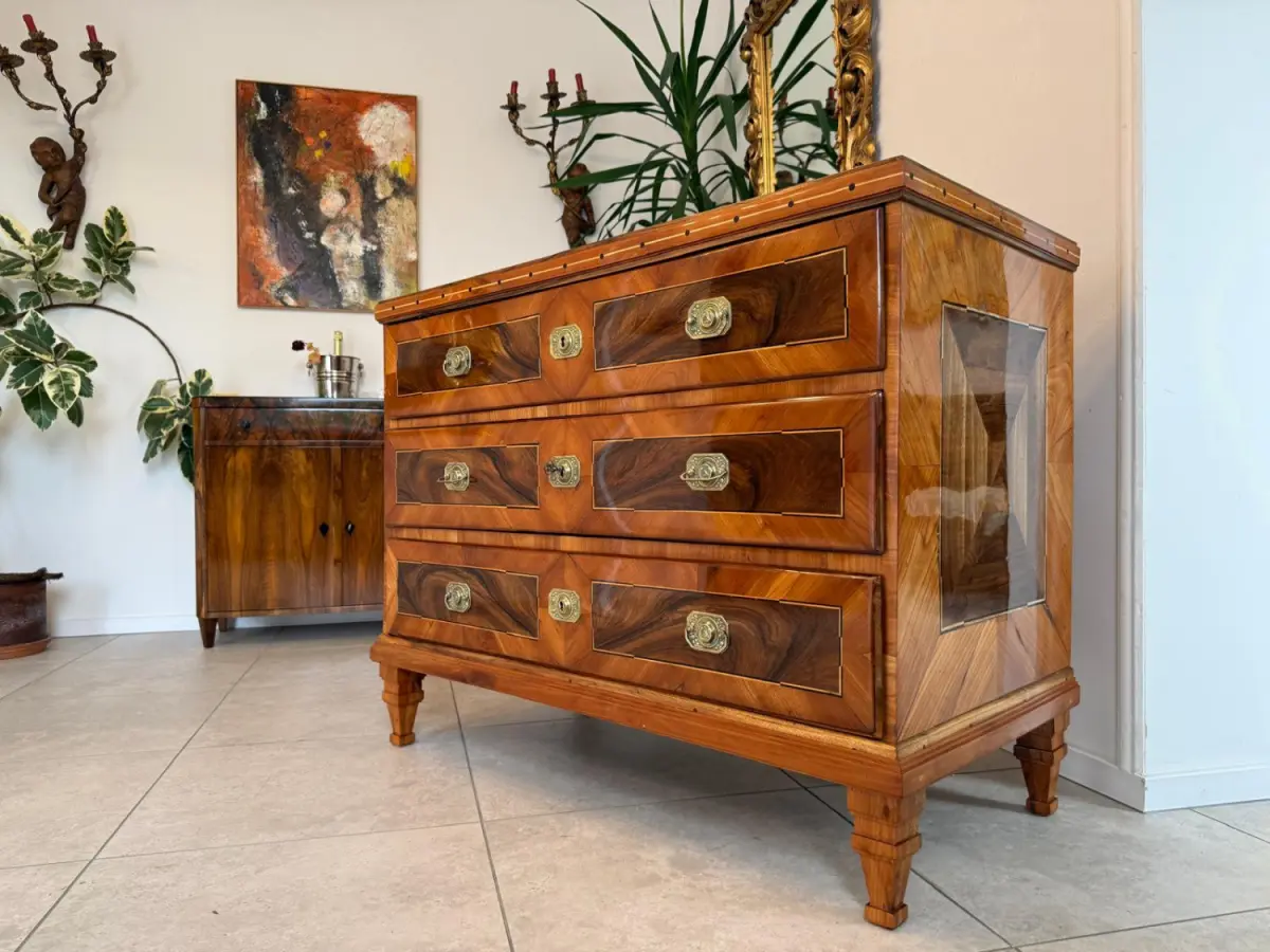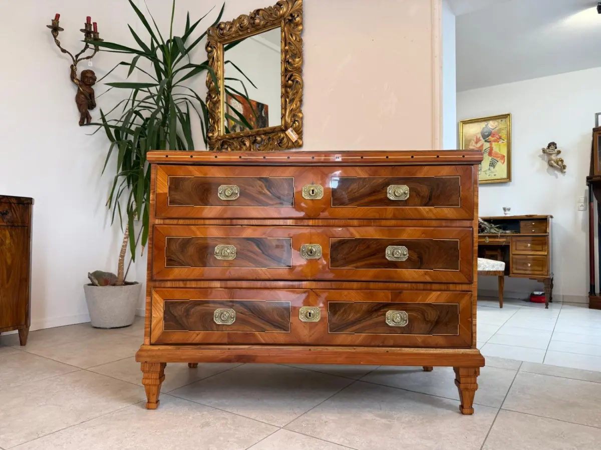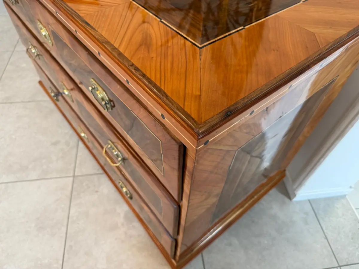 Besonders prägend sowie auffallend ist das Furnierbild aus Nussholz welches sich am Gesamtbild der Kommode spiegelt sowie welches sich über alle 4 Laden sowie Sekretärteil erstreckt.