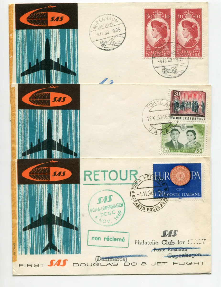 SAS Tokyo/Rom und Kopenhagen/Rom/Kopenhagen - drei Umschlag-Aerogramme - SAS Tokyo/Rom und Kopenhagen/Rom/Kopenhagen - drei Aerogramme für Flüge vom 12.10.60 und 4.11.60 (Kat. Pilger Nr. 1253, 1261 und 1262) Umschläge von mittelmäßiger Qualität für Scotchspuren links (perfekte Briefmarken) - Bewertung 160 Cod. 594/14