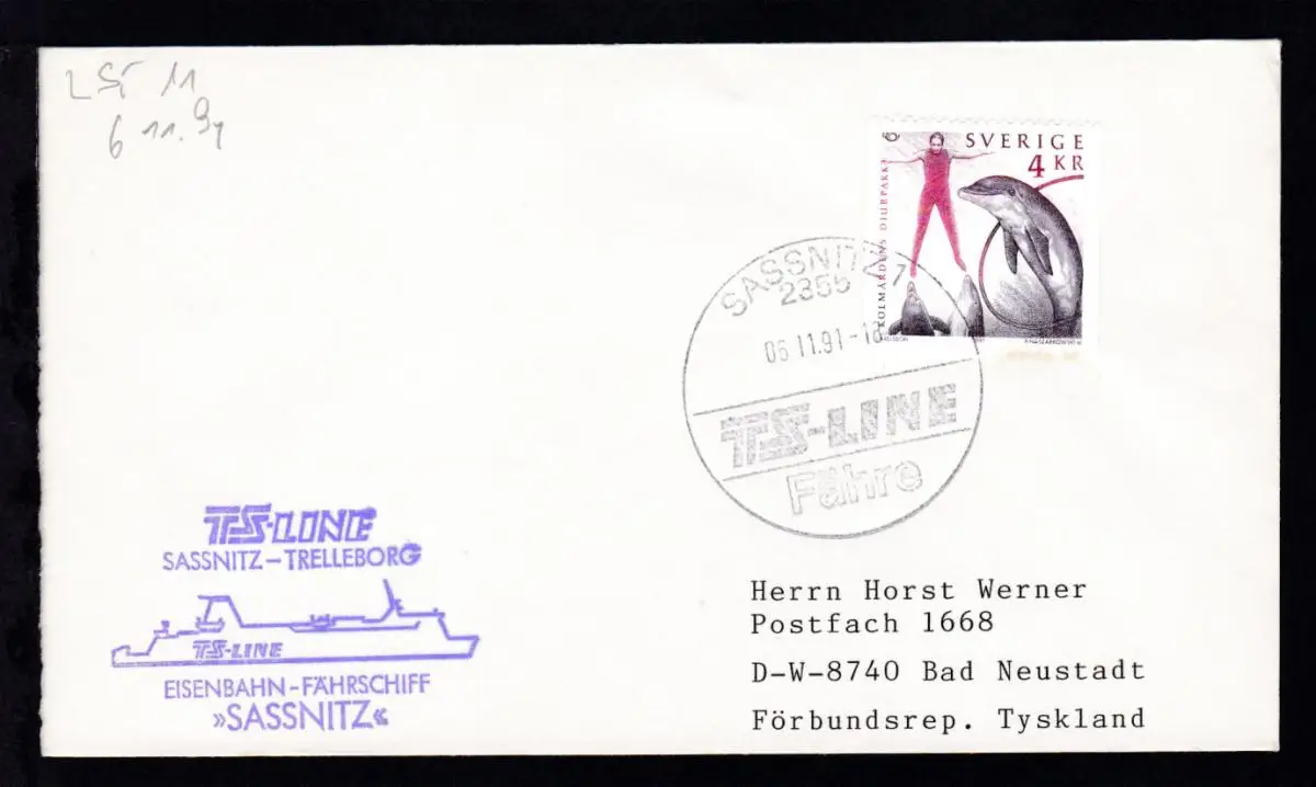 SASSNITZ 1 2355 TS-LINE Fähre 06.11.91 + Cachet MS Sassnitz auf Brief