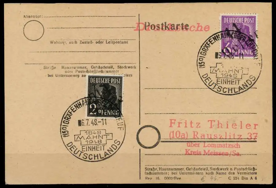 2 Pfg + 6 Pfg Wert aus der 2. Kontrollratsausgabe mit Handstempelaufdruck, Bezirk 14 Dresden