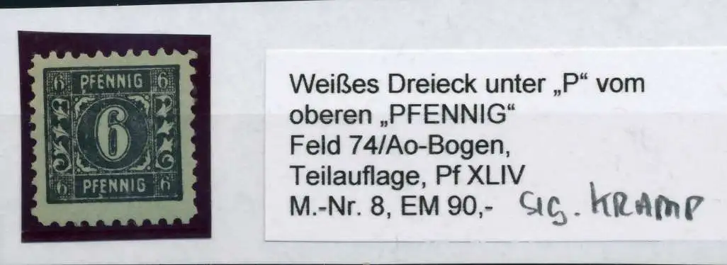 6 Pfg Wert aus der Freimarkenausgabe Wertziffer, Bauer und Getreideähren, auf grünem Papier, mit Plattenfehler XLIV