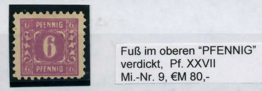 6 Pfg Wert aus der Freimarkenausgabe Wertziffer, Bauer und Getreideähren auf weißem Papier, mit Plattenfehler XXVII