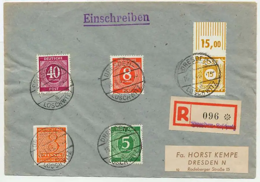 15 Pfg Wert aus der Freimarkenausgabe Ziffernserie, deutsche Inschrift, Durchstich Loschwitz + Ziffernausgabe auf Einschreiben, rückseitig AKS Dresden N6
