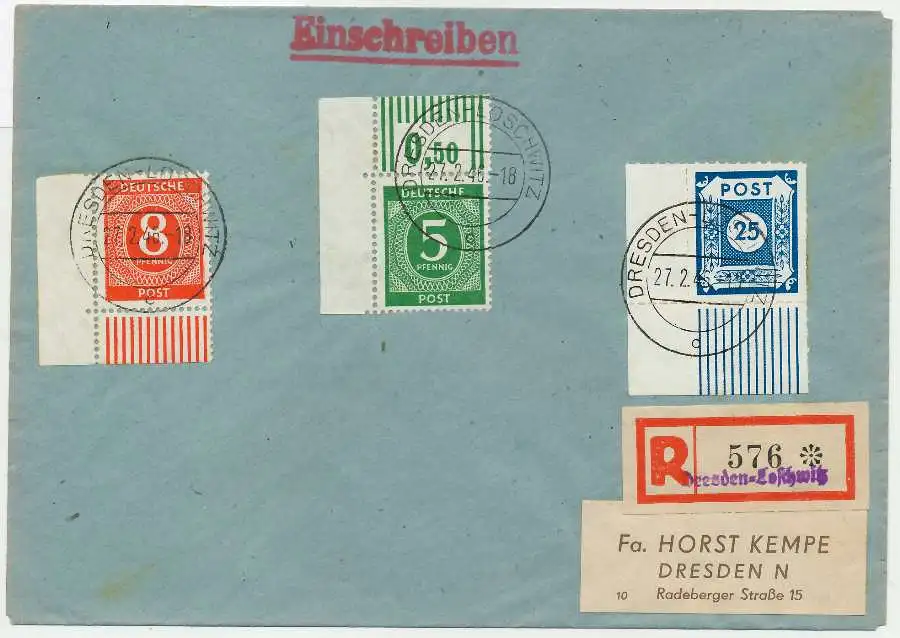 25 Pfg Wert aus der Freimarkenausgabe Ziffernserie, deutsche Inschrift, Durchstich Loschwitz + Ziffernausgabe auf Einschreiben, rückseitig AKS Dresden N6