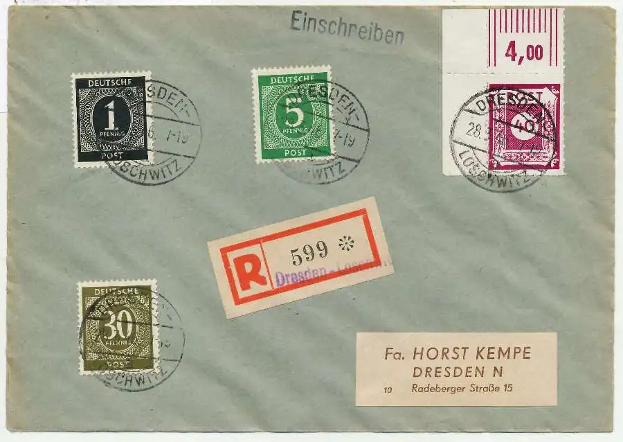 50 Pfg Wert aus der Freimarkenausgabe Ziffernserie, deutsche Inschrift, Durchstich Loschwitz + Ziffernausgabe auf Einschreiben, rückseitig AKS Dresden N6