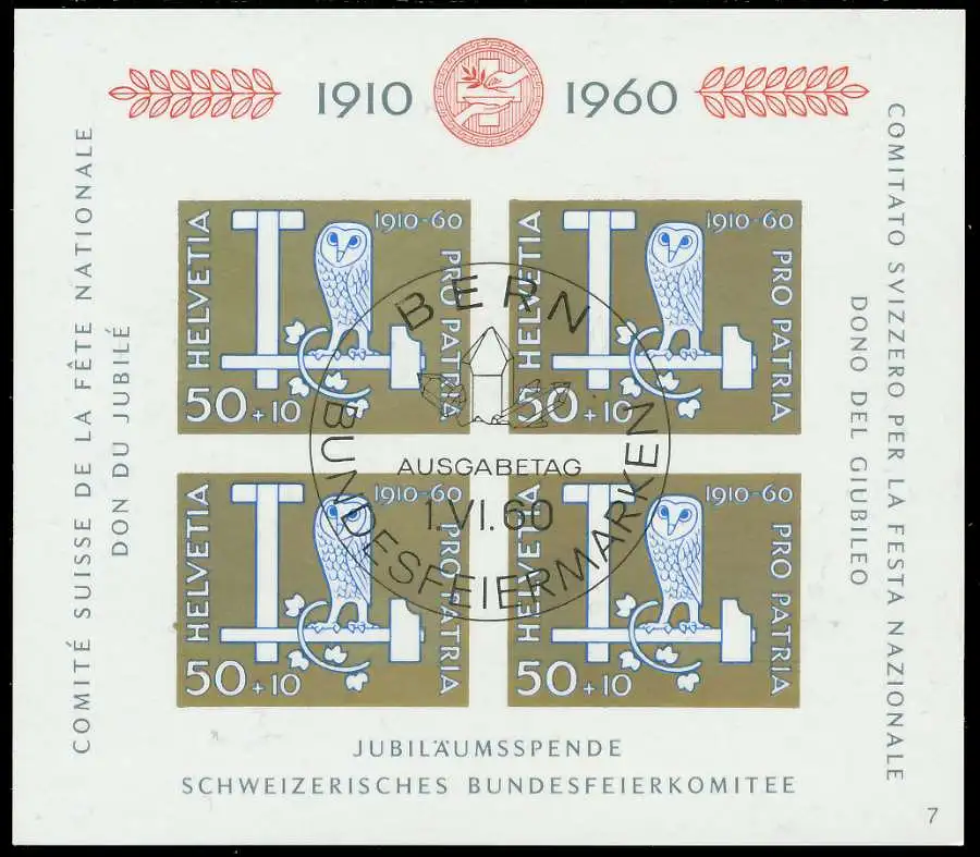 Blockausgabe Pro Patria von 1960, mit ESST und Formnummer 7
