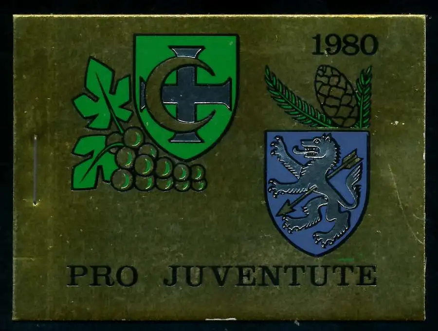 Markenheftchen Pro Juventute 1980, die goldenen Deckel sind naturgemäß etwas anfällig für Druck und Kratzspuren, die auf dem Scan aber wesentlich stärker hervortreten als tatsächlich vorhanden.