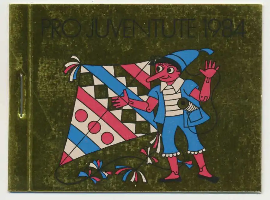 Markenheftchen Pro Juventute 1984, die goldenen Deckel sind naturgemäß etwas anfällig für Druck und Kratzspuren, die auf dem Scan aber wesentlich stärker hervortreten als tatsächlich vorhanden.