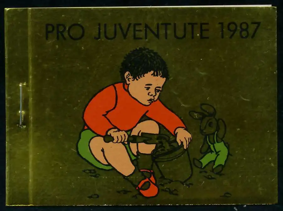 Markenheftchen Pro Juventute 1987, die goldenen Deckel sind naturgemäß etwas anfällig für Druck und Kratzspuren, die auf dem Scan aber wesentlich stärker hervortreten als tatsächlich vorhanden. Druckspuren durch Heftklammer auf dem Deckel.