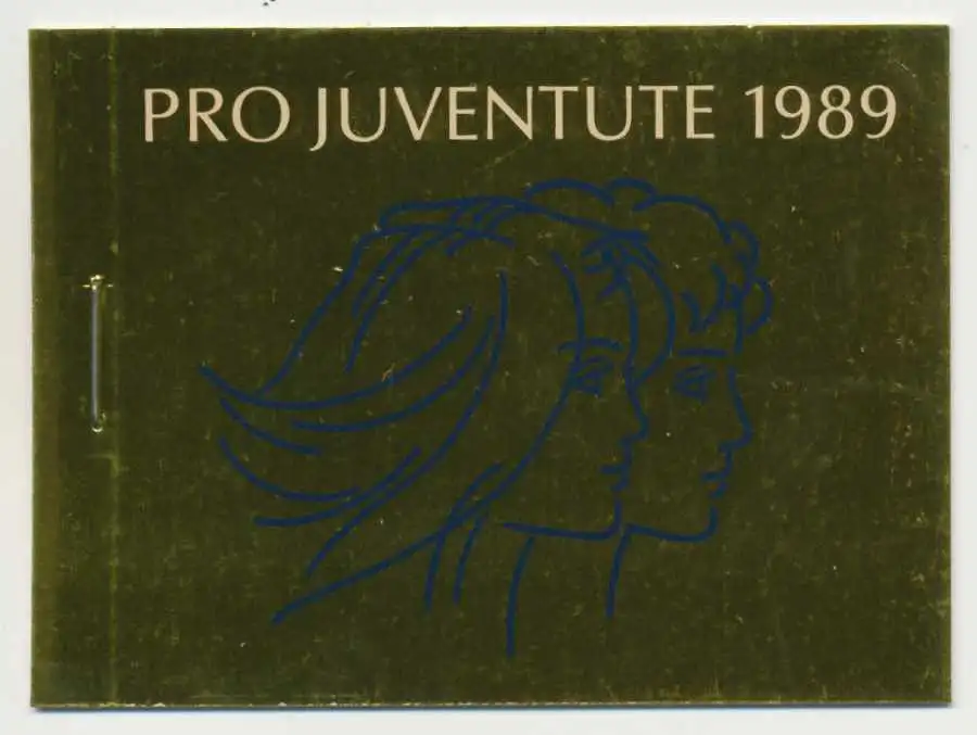 Markenheftchen Pro Juventute 1989, die goldenen Deckel sind naturgemäß etwas anfällig für Druck und Kratzspuren, die auf dem Scan aber wesentlich stärker hervortreten als tatsächlich vorhanden.