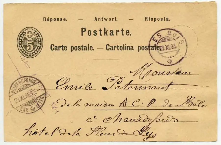 Postkarte Antwortteil ES BUIS / CHAUX DE-FONDS