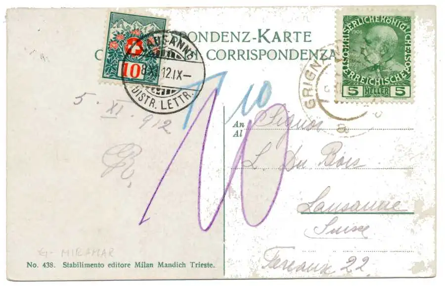 10 C-Wert aus der Portomarkenausgabe Alpenrosen und Gebirgslandschaft auf Postkarte von GRINANC (Österreich) nach LAUSANNE, dort mit 10 Rp Nachporto belegt