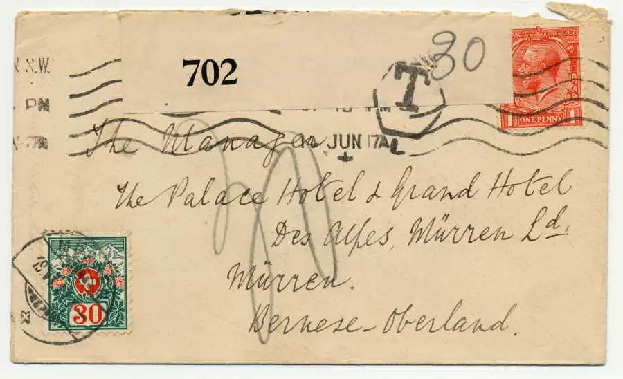 30 C-Wert aus der Portomarkenausgabe Alpenrosen und Gebirgslandschaft als Nachporto auf Breif aus England