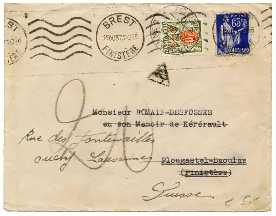 20 C-Wert aus der Portomarkenausgabe Kinder mit Wertschild auf Brief von Brest (Frankreich) vom 19.11.1937 in die Schweiz, dort mit 20Rp Nachporto belegt