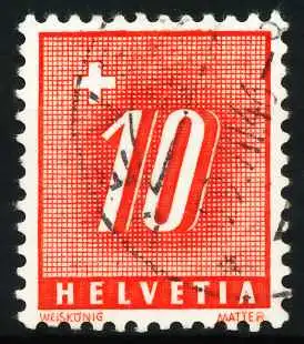 10 C-Wert aus der Portomarkenausgabe Wertziffern und Schweizer Kreuz auf rot gerastertem Hintergrund