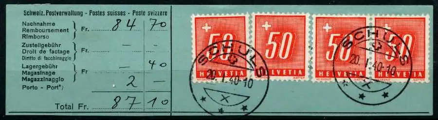 4 mal 50 C-Wert aus der Portomarkenausgabe Wertziffern und Schweizer Kreuz auf rot gerastertem Hintergrund, auf Paketzettel mit Nachnahme