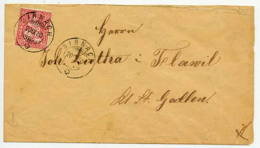 10 C Wert aus der Ausgabe sitzende Helvetia, weißes Papier, Farbänderungen, auf der Kuvertrückseite Rechenlisten, Bedarfsspuren