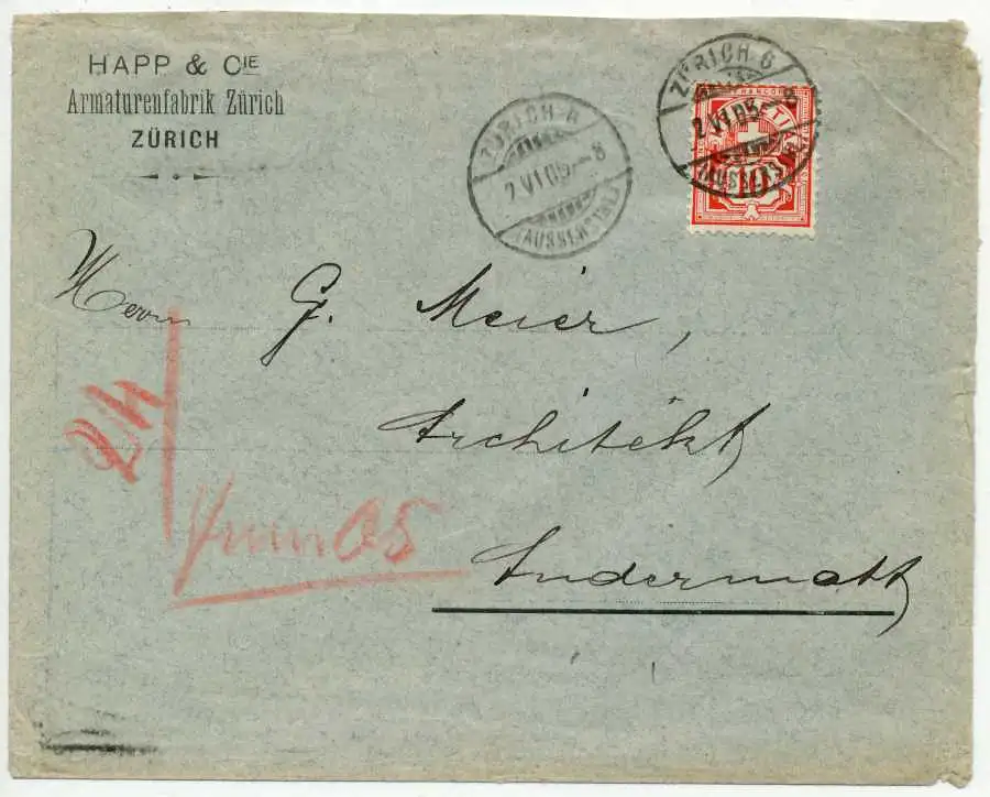 10 C Wert aus der Freimarkenausgabe Kreuz über Wertschild (Faser-Papier), auf Brief ZÜRICH