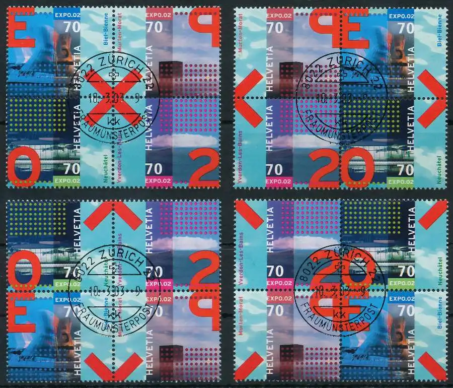 70C + 70C + 70C + 70C alle 4 möglichen Viererblockkombinationen aus der Ausgabe EXPO 2002 (MichelNr.: 1785, 1786, 1787, 1788)