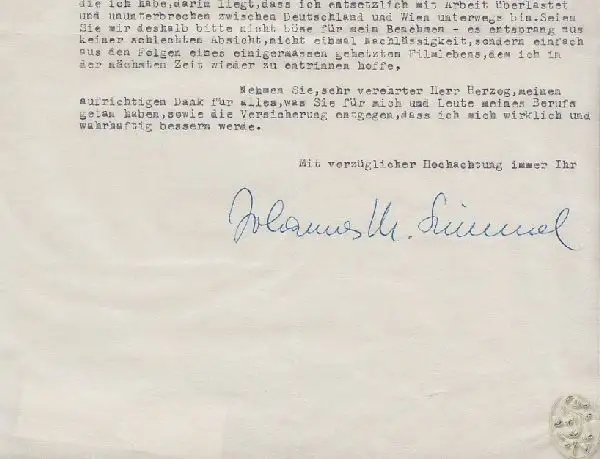 Bemerkungen: An den Buchhändler Herzog. "...dass ich entsetzlich mit Arbeit überlastet und ununterbrochen zwischen Deutschland und Wien unterwegs bin ... aus den Folgen eines einigermassen gehetzten Filmlebens, dem ich in der nächsten Zeit zu entrinnen hoffe.
