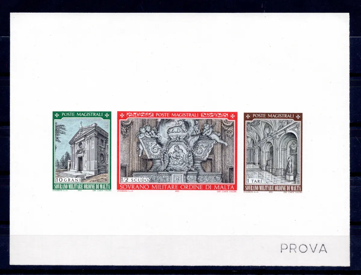 Ohne Gummi - SMOM - Weihnachten 1970 Nr. 62/64 der Druckprobebogen auf weißem Papier, ohne Wasserzeichen mit Proofstempel unten rechts Euro-Katalog Cod.1808/WEB