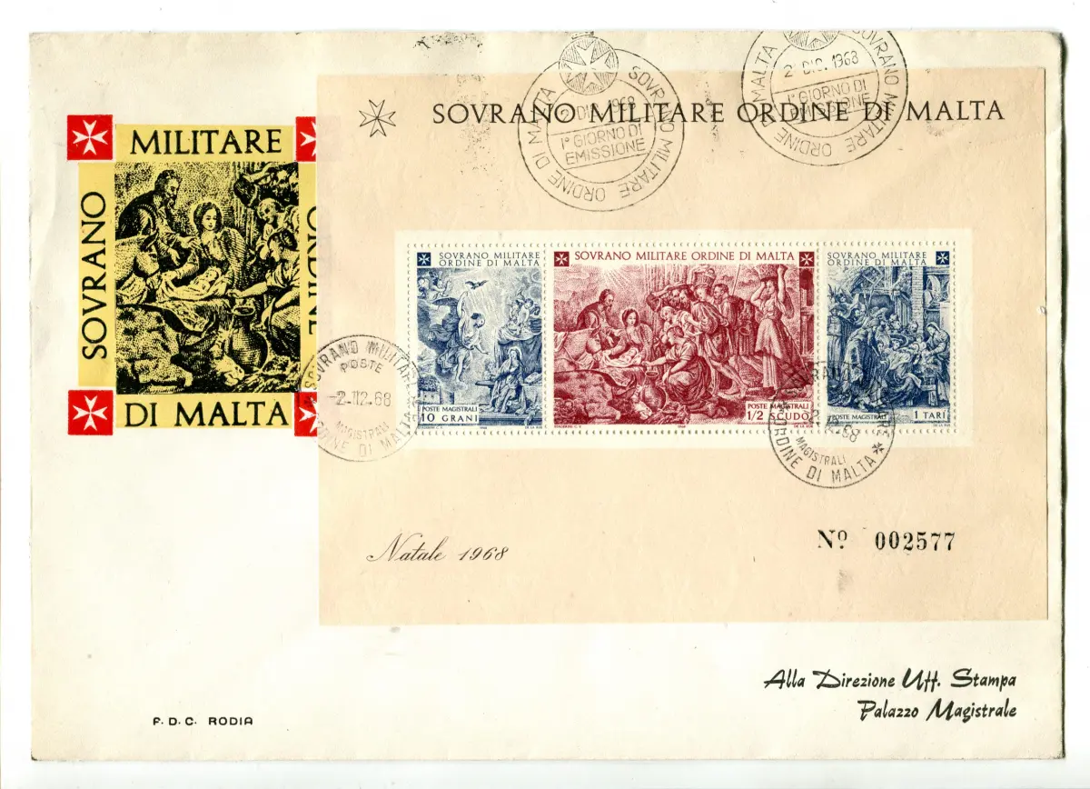 SMOM Weihnachtsblatt 1968 auf FDC Umschlag - Weihnachtsblatt 1968 auf FDC Ausgabe Rhodos - Uncommon Cod. 1545/WEB