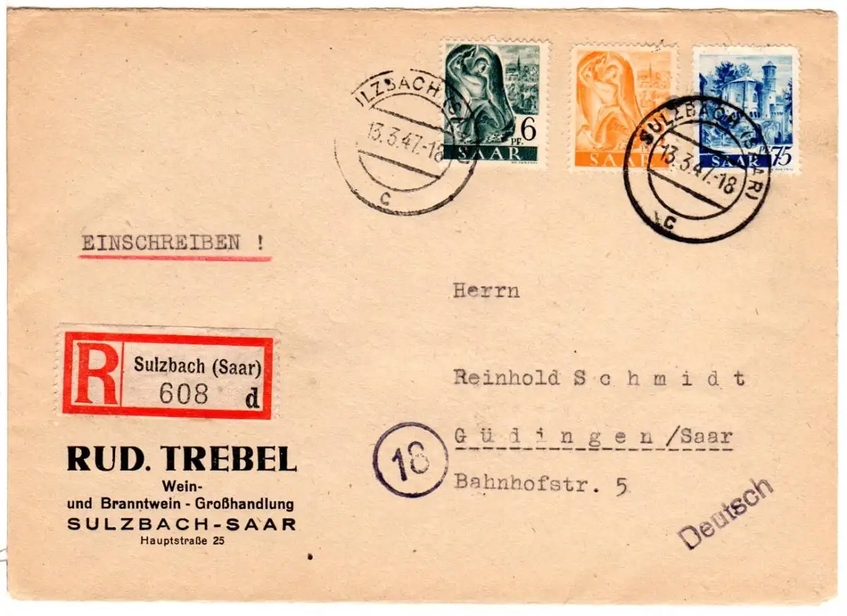 Saar 1947, 3+6+75 Pf. auf Firmen Einschreiben Brief v. Sulzbach n. Güdingen