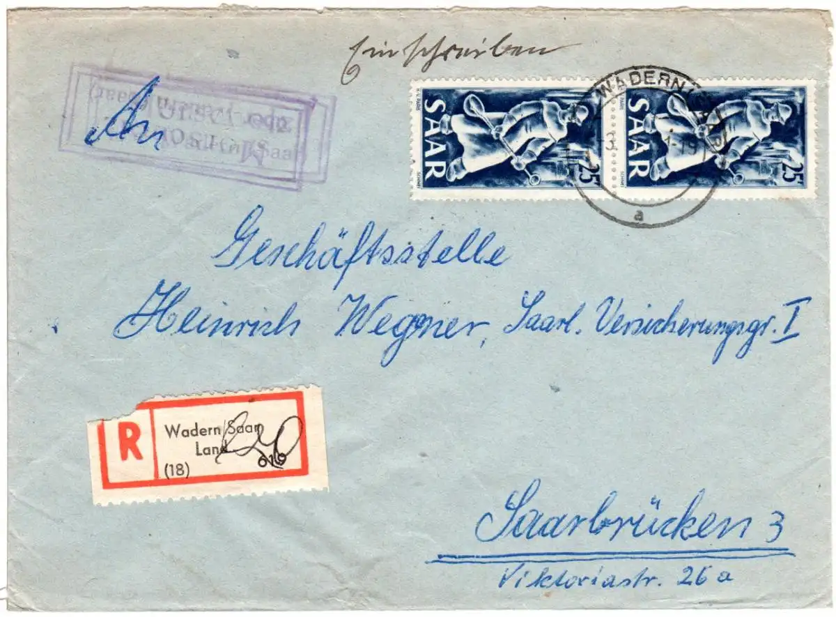 Poststellen II -Stempel auf Einschreiben Brief m. MeF 25 F. Eisen- u. Stahlindustrie. Rekozettel Wadern (Saar) Land.