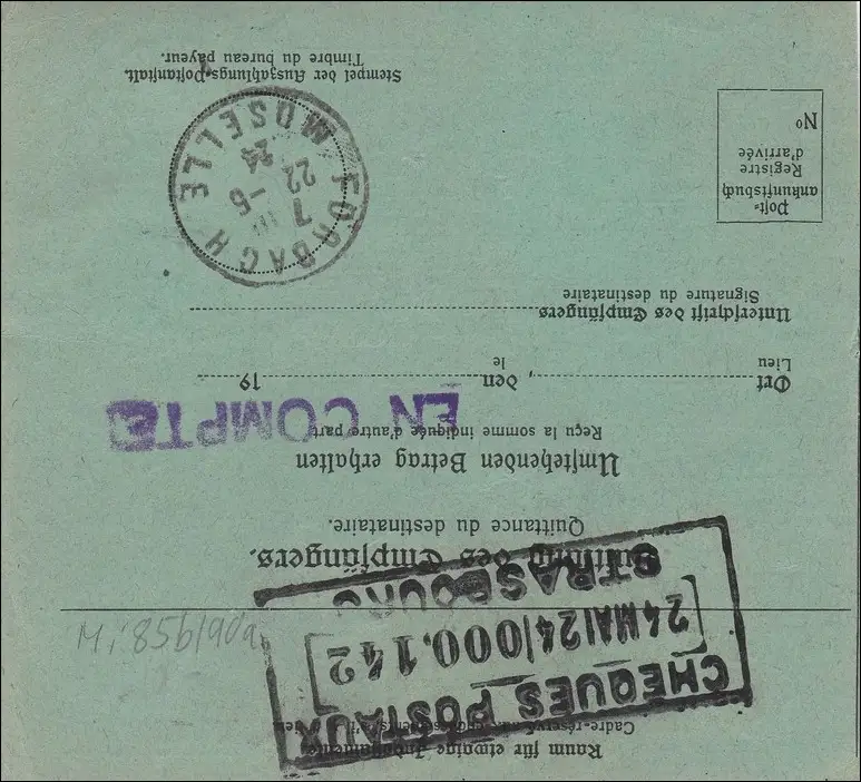 Saargebiet: Postauftrag-Postanweisung von Neunkirchen nach Forbach 1924